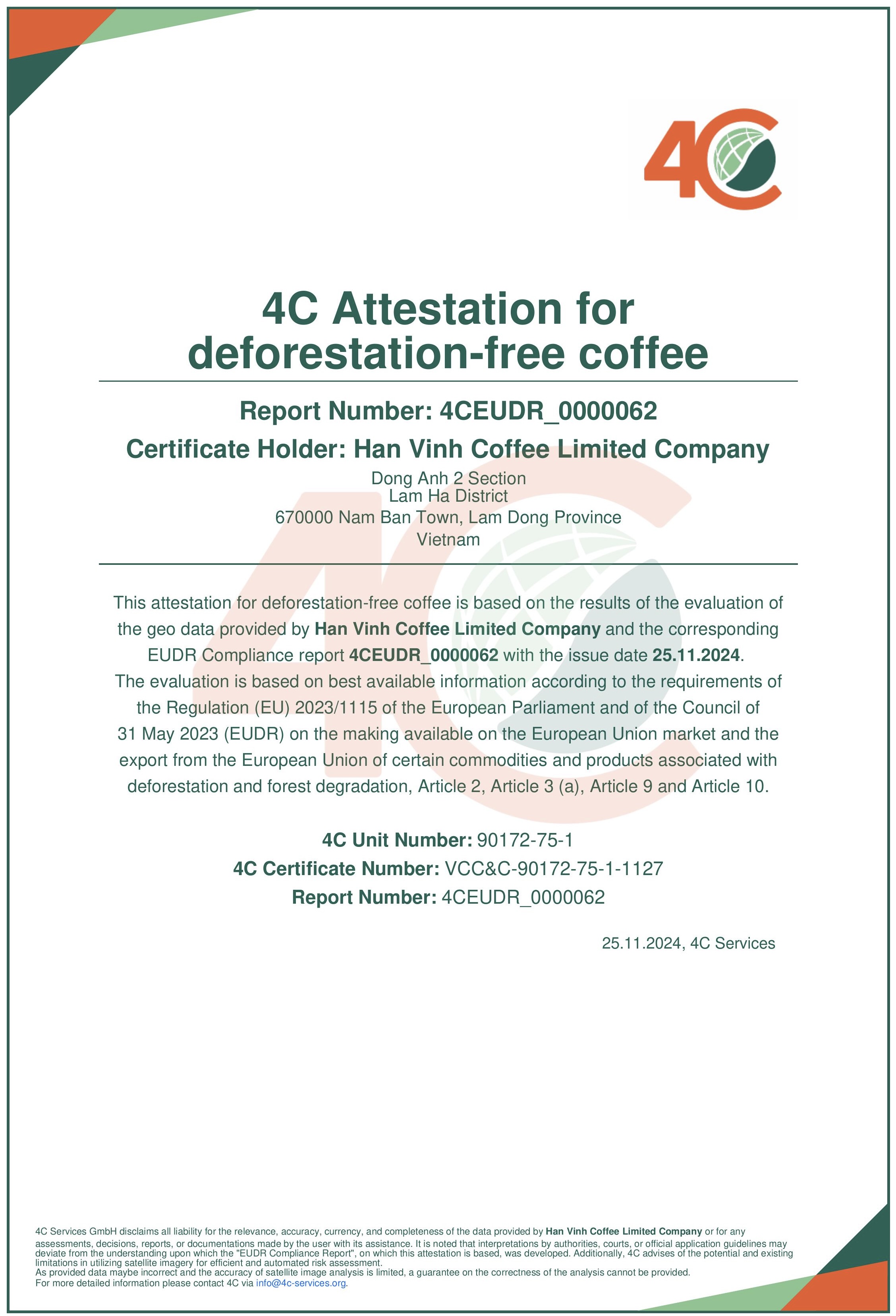 Chứng nhận 4C - Công ty TNHH Cà phê Hân Vinh sẵn sàng đáp ứng & tham gia vào xu hướng phát triển bền vững