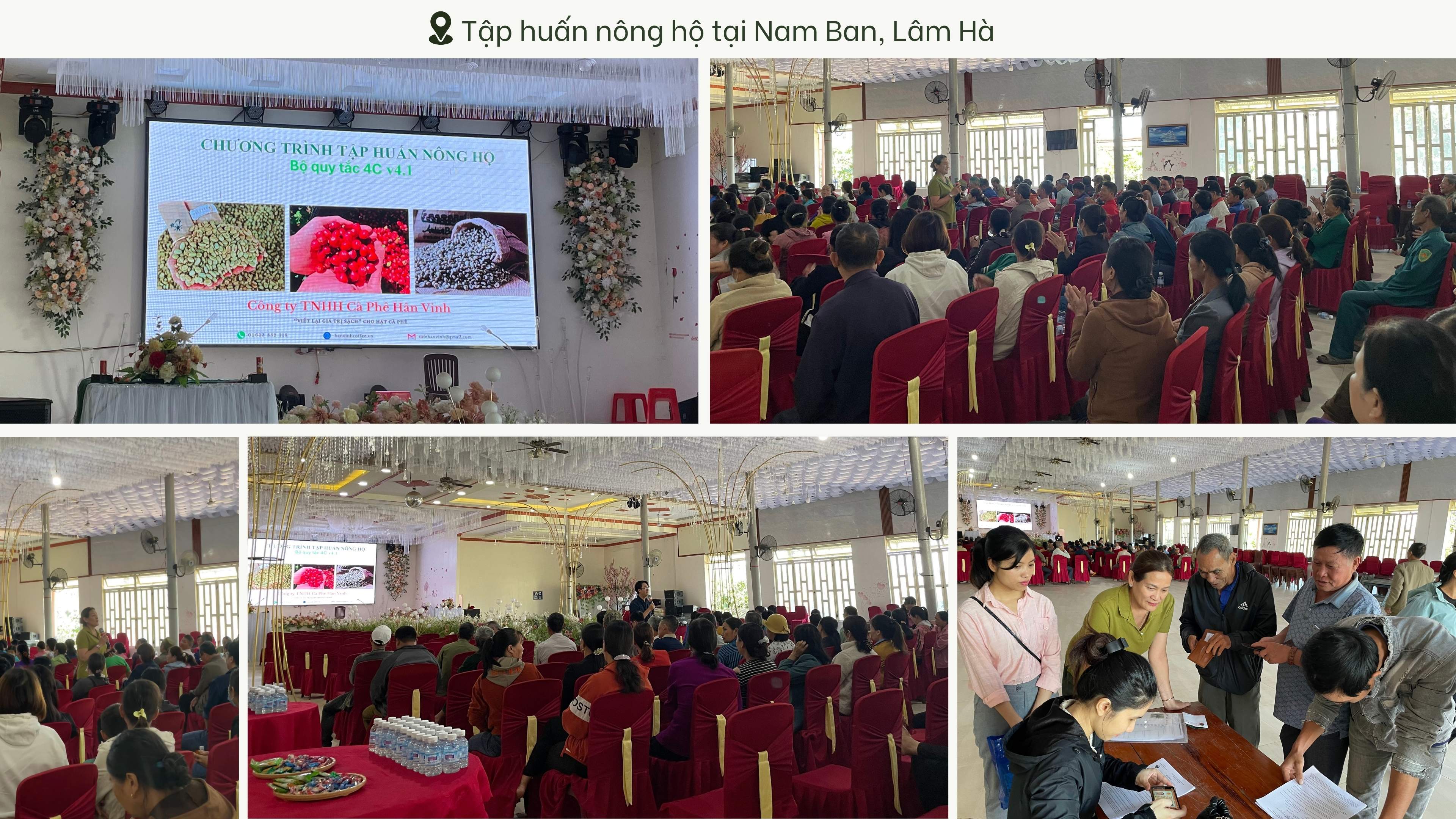 Công ty TNHH Cà phê Hân Vinh đã tổ chức tập huấn cho các nông hộ tại Nam Ban (Lâm Hà) và Cầu Đất (Đà Lạt) giúp bà con hiểu rõ hơn các tiêu chuẩn, quy định của chứng nhận 4C. Hướng dẫn kỹ thuật chăm sóc, cách sử dụng phân bón hữu cơ, ghi chép nhật ký nông hộ để theo dõi quá trình chăm sóc cà phê theo đúng quy cách...