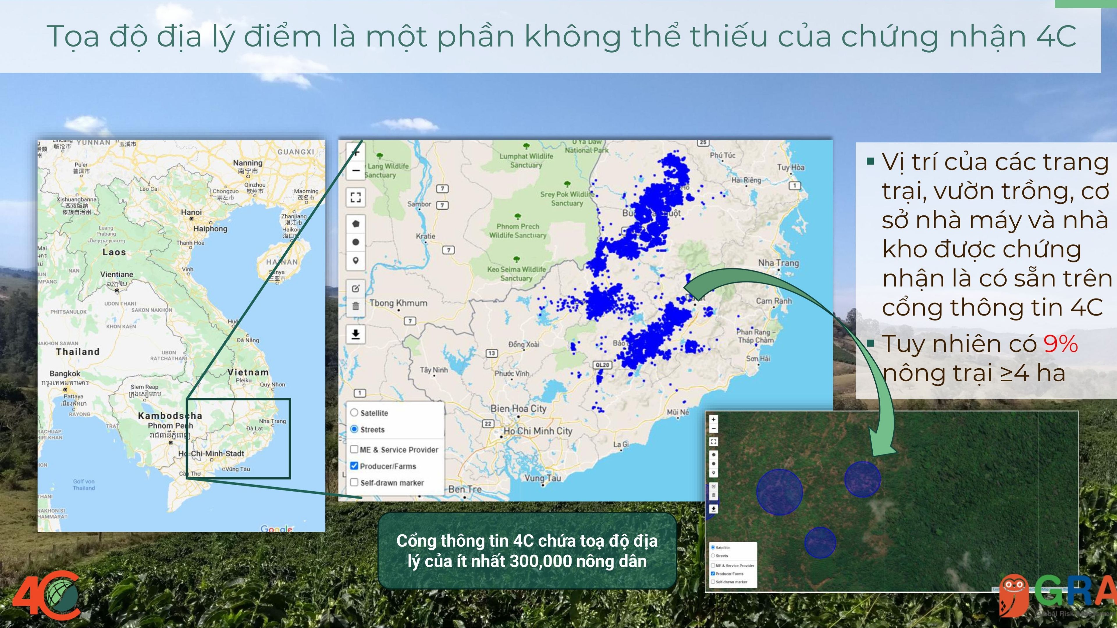 Một điều nổi bật nhất của chứng nhận 4C là xác thực dữ liệu địa lý. Diện tích vườn cà phê của nông hộ liên kết với công ty phải định vị được toạ độ địa lý hợp pháp, đáp ứng tiêu chuẩn liên quan đến không gây mất rừng và truy xuất được nguồn gốc sản phẩm. Kết quả phân tích của bản đồ GRAS phải thể hiện được diện tích cà phê 4C không chồng lấn với diện tích đất rừng.